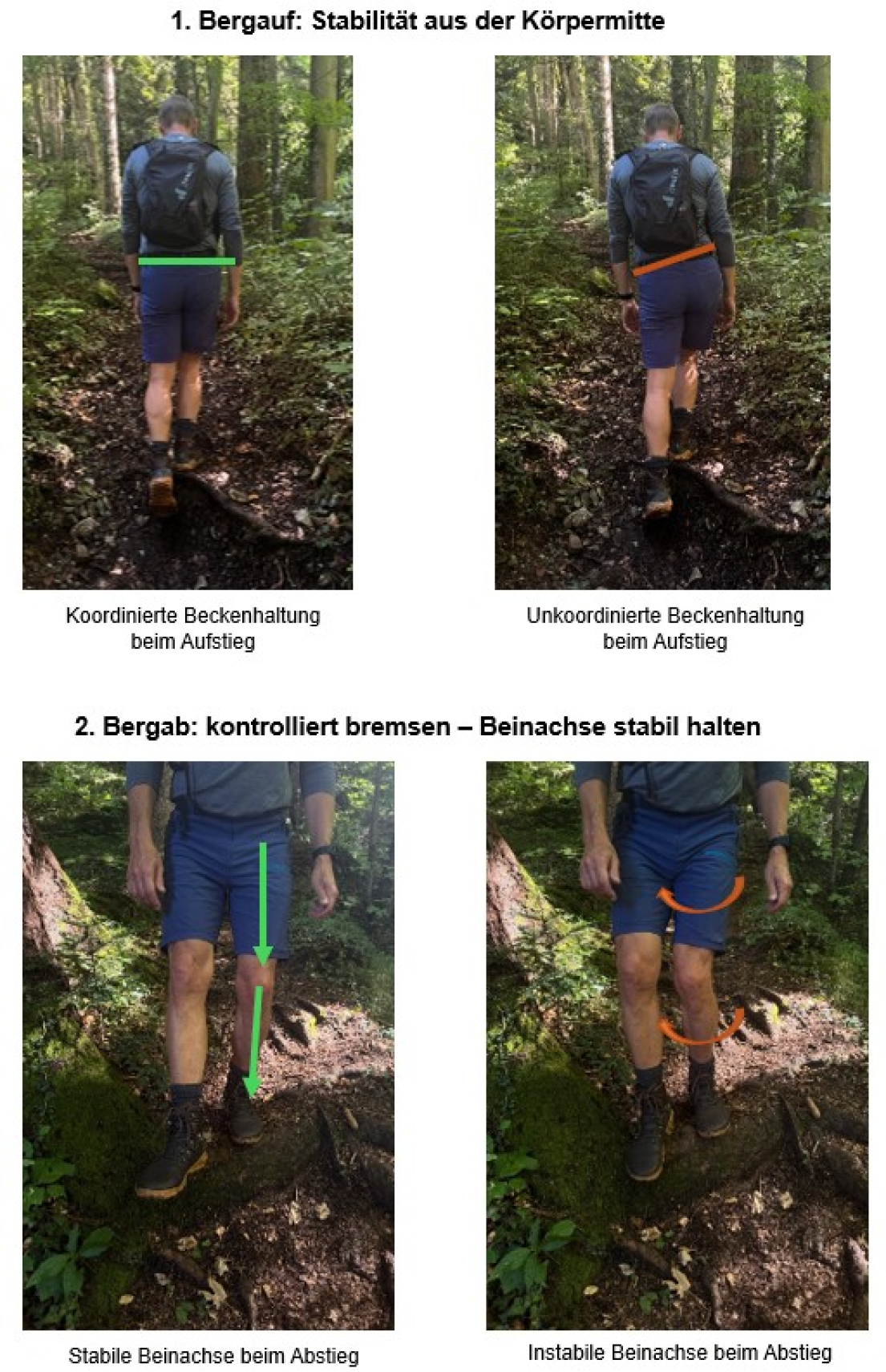 Beim Aufstieg ist dein Becken das zentrale Kraftzentrum. Achte auf eine ausbalancierte Beckenstellung, damit die Kraft gut in die Beine übertragen werden kann. So kannst du deine Beinachse besser koordinieren, Bewegungen effizienter gestalten und einseitige oder übermäßige Belastungen vermeiden. - Bergab: kontrolliert bremsen – Beinachse stabil halten